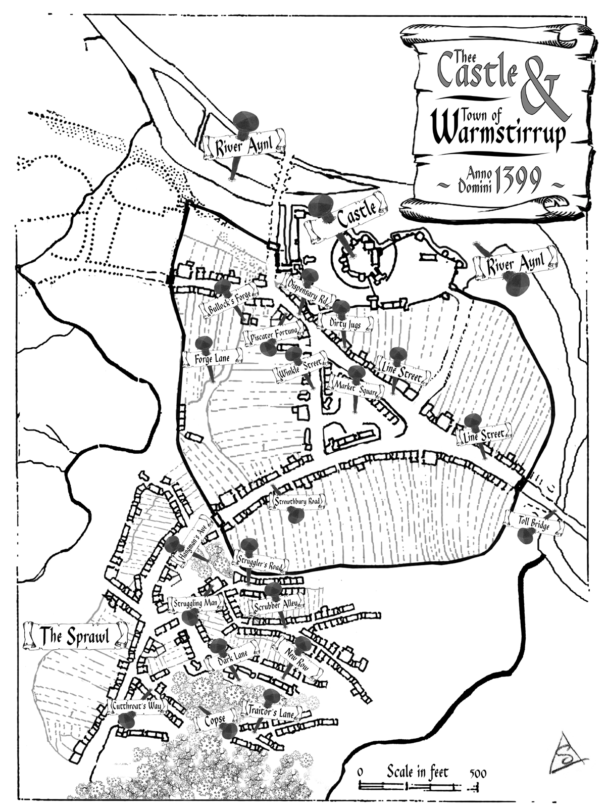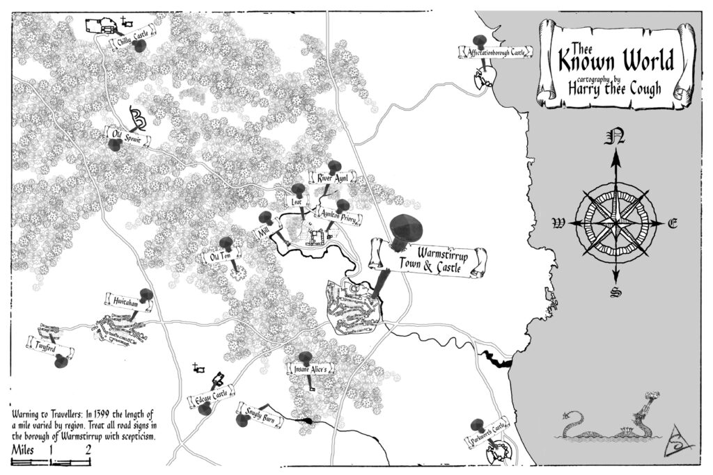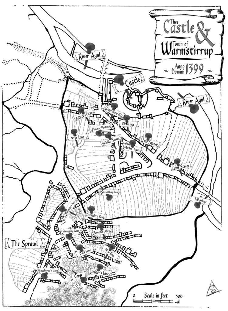 The plans of Warmstirrup and Warmstirrup Castle are very broadly based on the medieval castle and walled town of Alnwick, though the town walls were in fact built slightly later, towards the end of the 1470s. Dispensary Street is actually located a little further away from the castle to the west than it is in the story. However, the opportunity to place The Apothecaries’ building on Dispensary Street was a gift. Weirdly, I didn’t realise there was a Dispensary Street in Alnwick until after I’d written the book, but it was simply too good to miss, so I had to go back and add it to the story and the maps. The oldest pub in Warmstirrup is known as The Dirty Jugs – this is a rather clumsy homage to The Dirty Bottles, a public house in Alnwick famous for its rather unusual window decoration. The window facing onto the road is sealed and contains several ‘dirty bottles’. The story has it that a previous owner, roughly two hundred years ago, tried to remove them and instantly dropped dead. Funnily enough, no one has dared touch them since – hence the dust and the dirt!